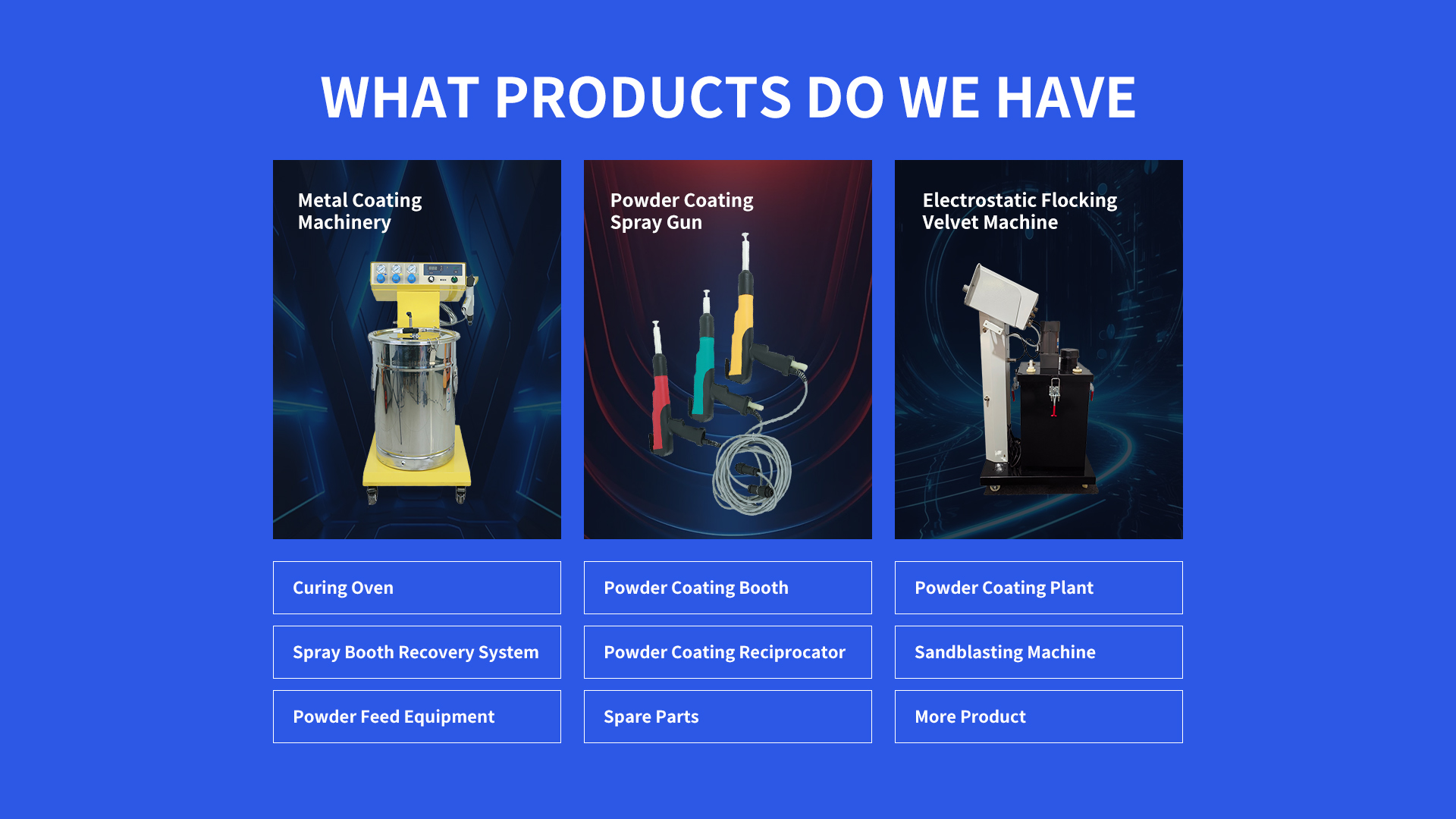 A Powder Coating Gun Factory specializes in manufacturing electrostatic spray guns and related systems. Key products include manual and automated spray guns, powder hoppers, voltage generators (20–100 kV), recovery systems, and IoT-enabled control units